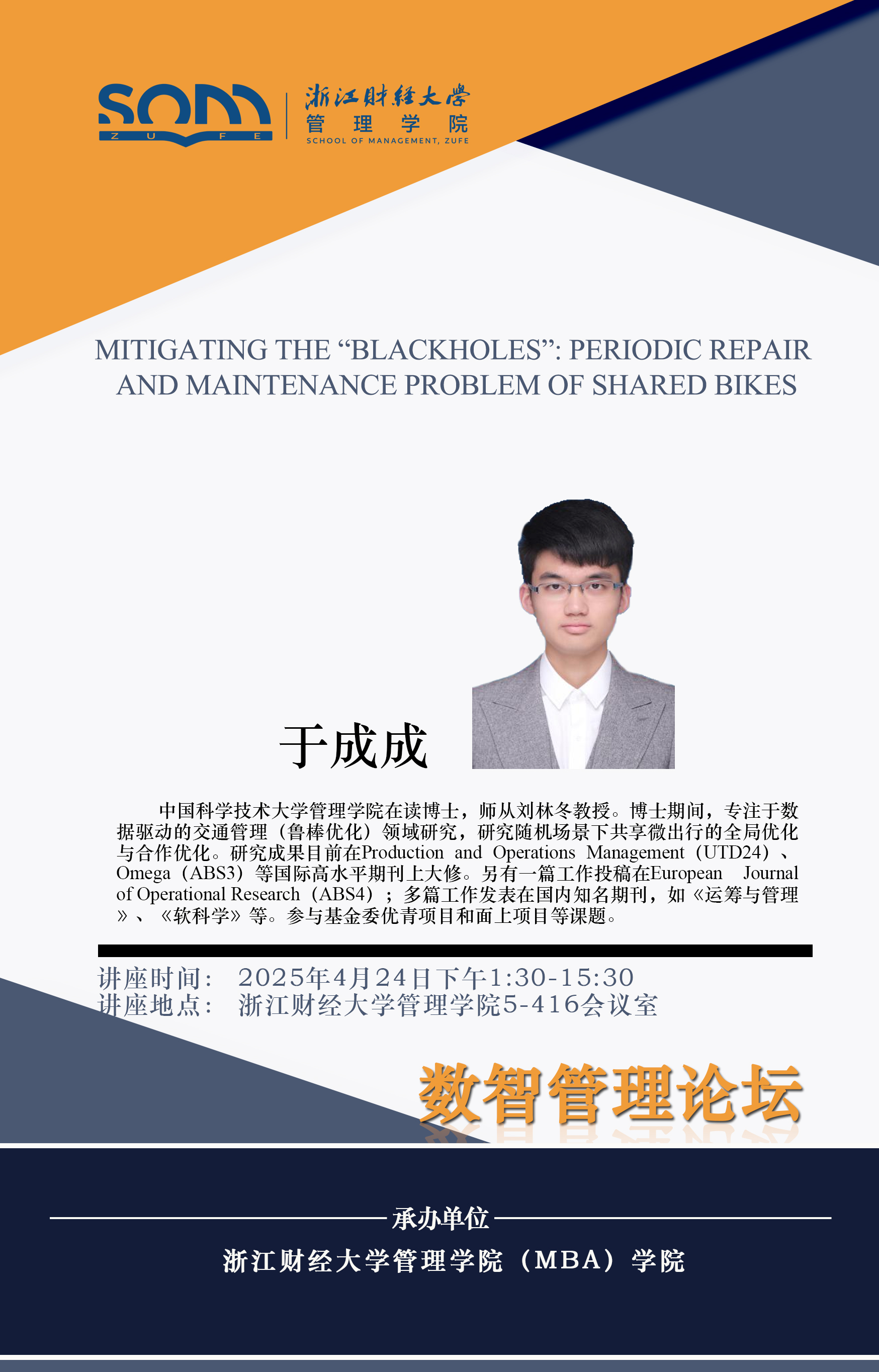 嘟嘟成人网 新财经战略系列学术活动2025年第21期【学术报告】于成成:Mitigating the “Blackholes” Periodic Repair and Maintenance Problem of Shared Bikes
