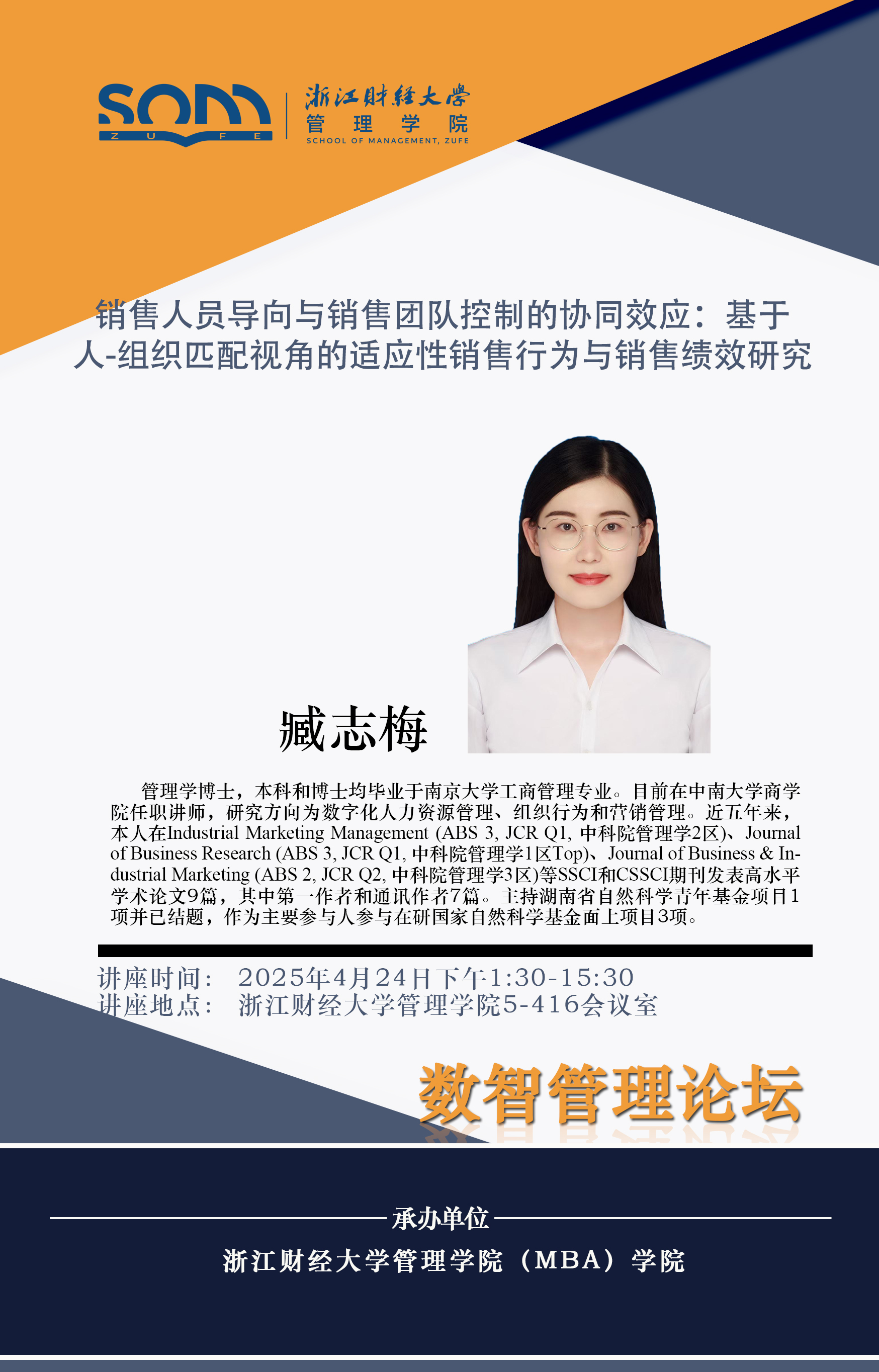 嘟嘟成人网 新财经战略系列学术活动2025年第23期【学术报告】臧志梅:销售人员导向与销售团队控制的协同效应:基于人-组织匹配视角的适应性销售行为与销售绩效研究