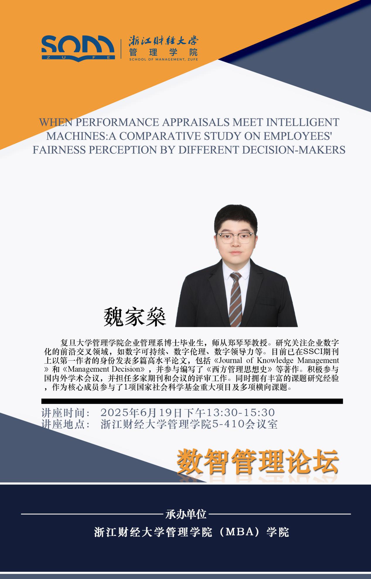 嘟嘟成人网 新财经战略系列学术活动2025年第44期【学术报告】魏家燊:When Performance Appraisals Meet Intelligent Machines A Comparative Study on Employees' Fairness Perception by Different Decision-makers