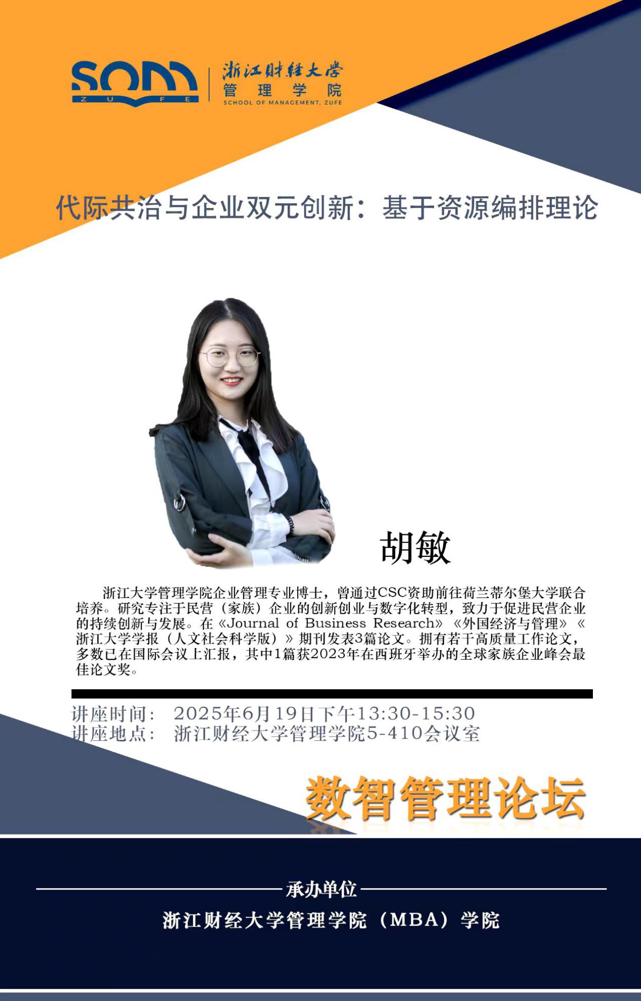 嘟嘟成人网 新财经战略系列学术活动2025年第45期【学术报告】胡敏:代际共治与企业双元创新:基于资源编排理论