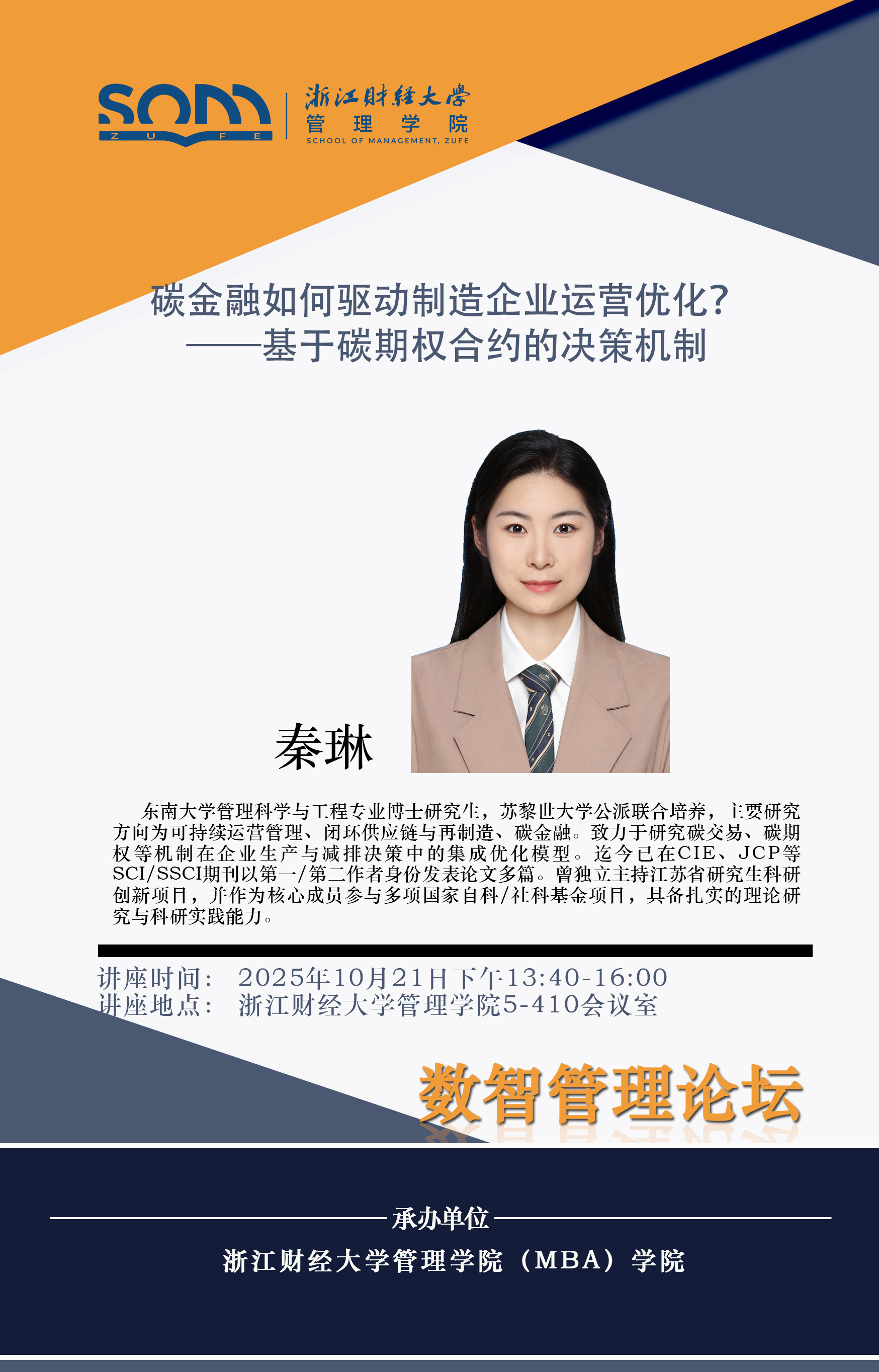 嘟嘟成人网 新财经战略系列学术活动2025年第52期【学术报告】秦琳:碳金融如何驱动制造企业运营优化?——基于碳期权合约的决策机制