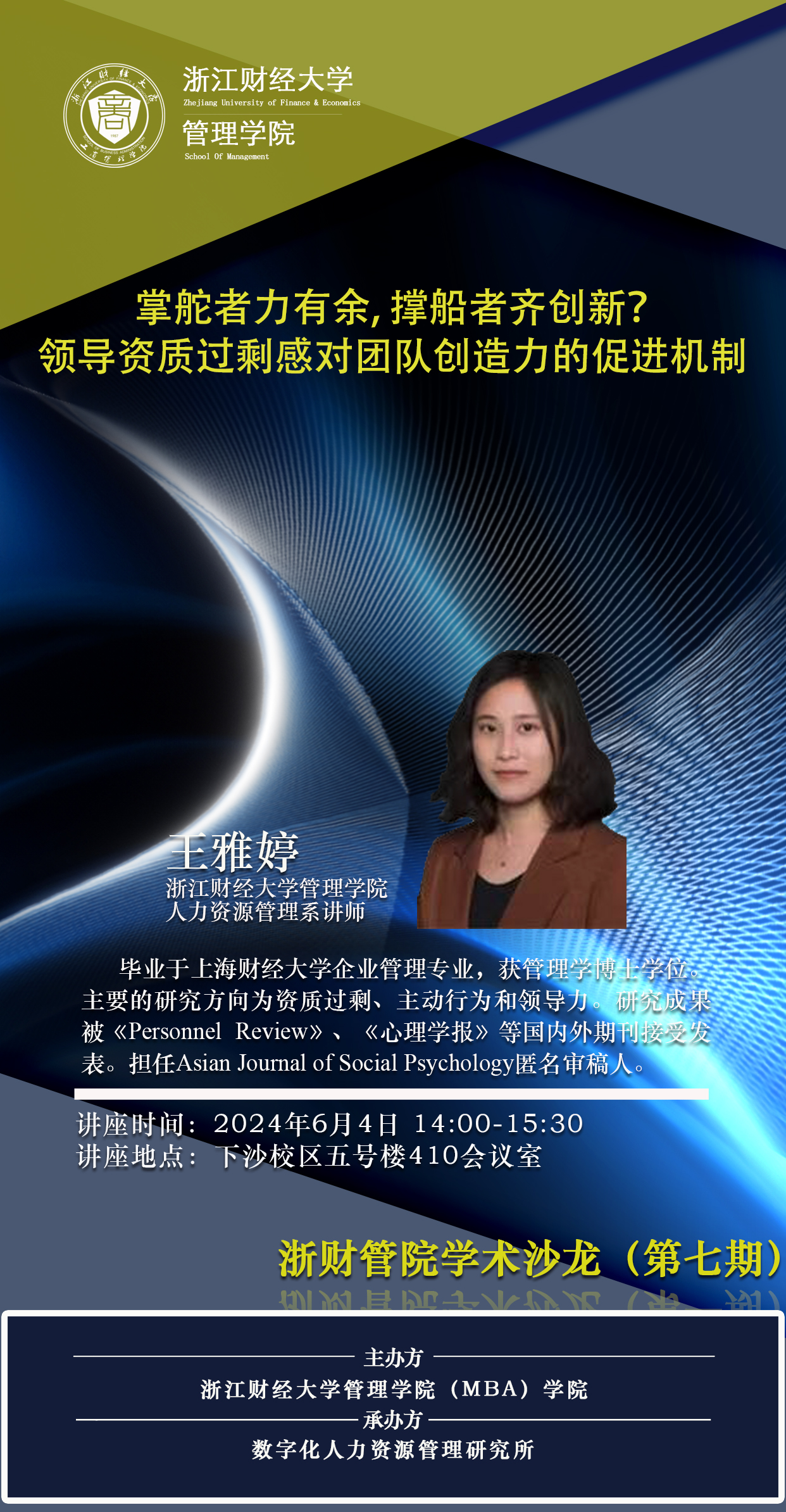 【浙财管院学术沙龙(第七期)预告】王雅婷:掌舵者力有余, 撑船者齐创新?领导资质过剩感对团队创造力的促进机制