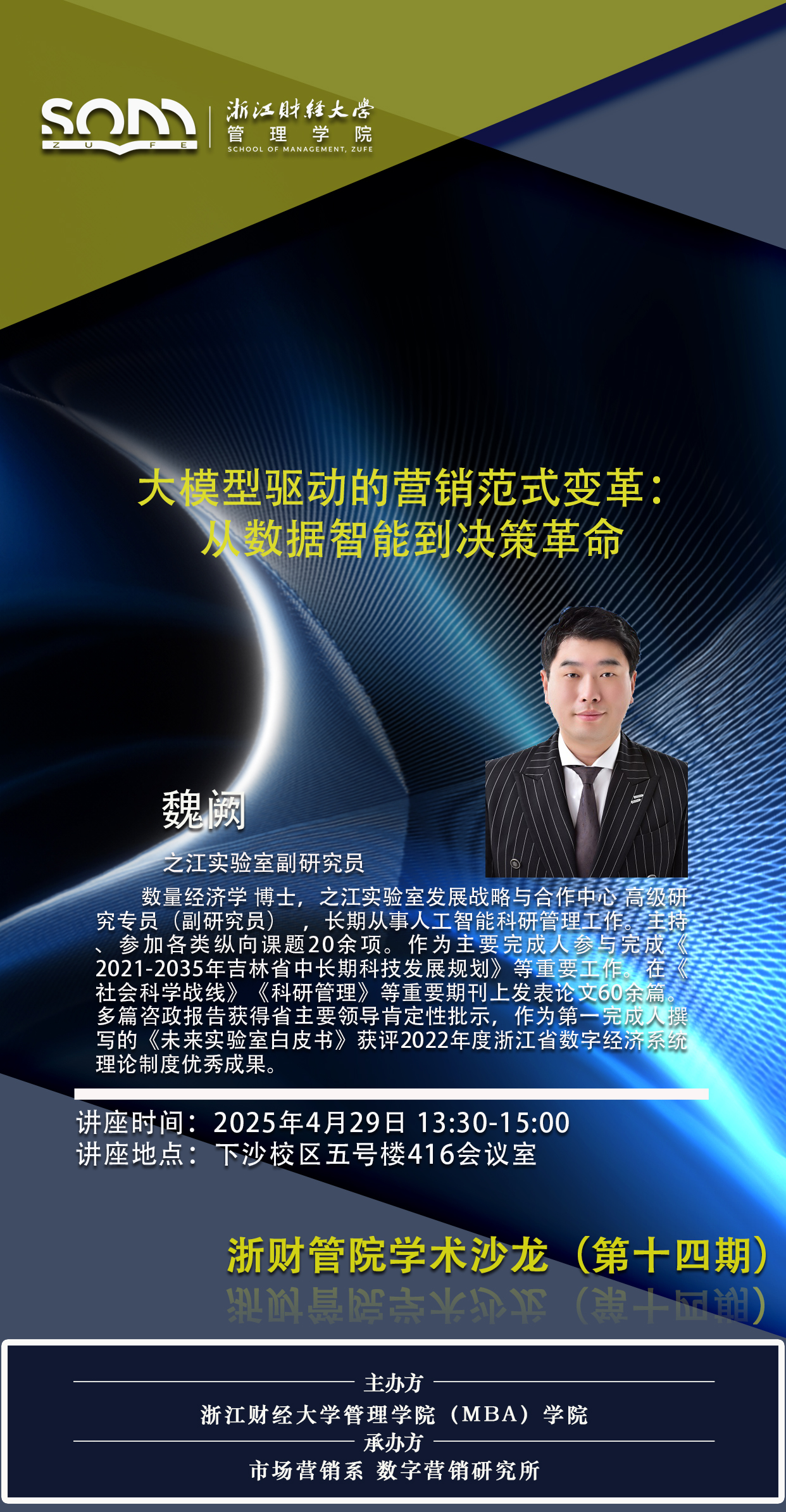 【浙财管院学术沙龙(第十四期)预告】魏阙:大模型驱动的营销范式变革从数据智能到决策革命】