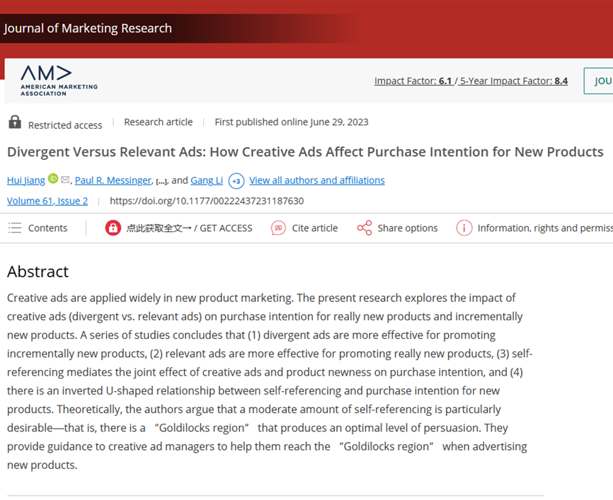 杨水清副教授作为通讯作者,撰写的“Divergent Versus Relevant Ads: How Creative Ads Affect Purchase Intention for New Products”(发散型vs.关联型:创意广告如何影响新产品购买意愿)被市场营销类国际顶级期刊 Journal of Marketing Research 录用并发表。