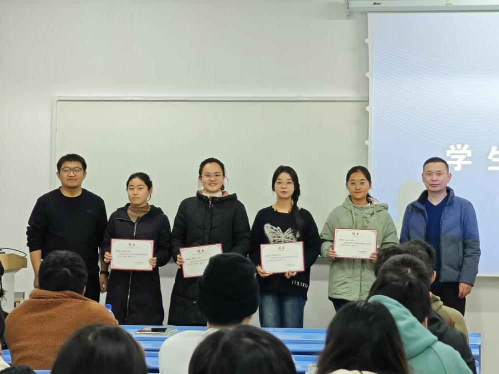 随后举行学生助教聘任仪式。张雷和李桢为补习班授课的四位学生助教颁发证书并合影留念。马硕指出,学生助教都是成绩优异,品学兼优的学生代表,是全体学生的榜样,希望同学们向他们学习。