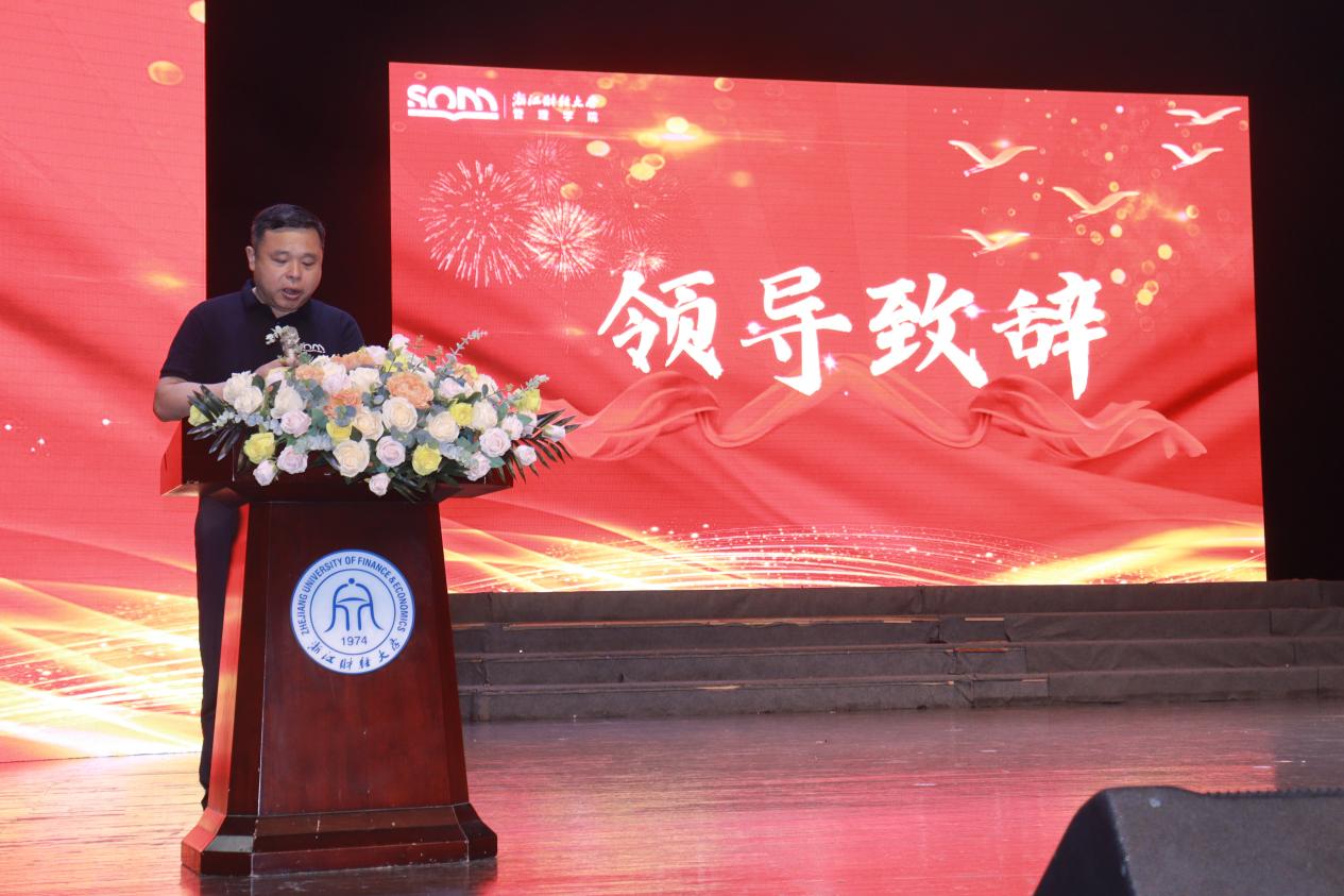 党委书记朱力明上台致辞。他向顺利完成学业的毕业生们表示热烈祝贺,回顾了同学们大学四年的成长与蜕变,肯定了大家在学术研究、社团活动、社会实践等方面取得的优异成绩。朱书记深情寄语毕业生,希望大家怀揣“经邦济世”的理想,在未来的人生道路上勇毅前行,无论何时何地都能坚守初心,常回母校看看。他的话语情真意切,饱含着对毕业生的深切关怀与殷切期望,为同学们的新征程点亮了方向。