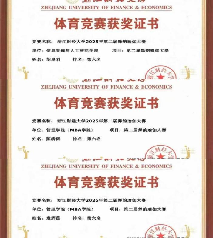 季佳怡同学所在的轻舞拾光队获得第二名,陈清雨、金依诺、袁辉蕴所在的依雨清辉队获得第六名,她们将瑜伽的柔美与力量融为一体,凭借扎实的功底与出色的临场发挥,为学院争光添彩!